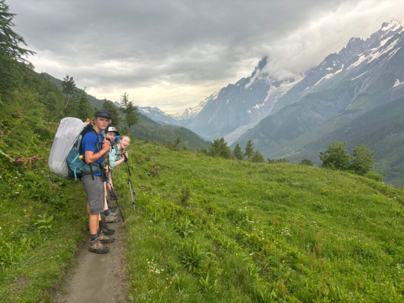 Reenergized from yesterday’s games, meditation, and croissants, AXB was back on the trail today! They started off by tackling an ascent before reaching a flatter gap-hike section overlooking the gorgeous Val Ferret. They picnicked on the trail with baguettes freshly baked that morning by “Nonna,” the grandmother of the group’s campground hosts in Plampincieux. They then finished out their hiking for the day with another descent and a final ascent to reach their rifugio for the night. There, they enjoyed a multi-course mountain-style Italian dinner before tucking into their bunk beds for a great night’s rest.