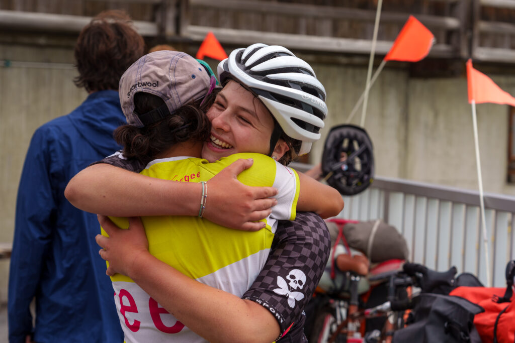 Big hugs shared after a long exciting ride on Europe Coast to Coast